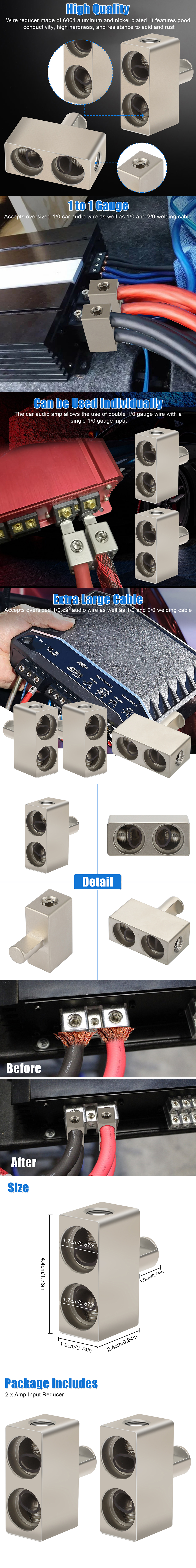 • Ideal for power or ground cable. Wire reducer can be used for most cars, effectively improving the transmission of sound quality.
