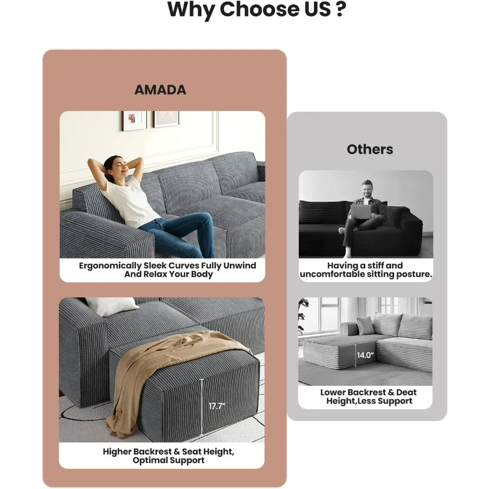 - 【Stronger Support & Spacious Seat】With a 20% higher backrest, our corduroy cloud couches provide enhanced support for your back and shoulders, ensuring comfort and stability. The oversized modular sofa features a deeper seat and wider arms, which enhance comfort and provide more space for your essentials. Whether you're sitting, lying, or leaning, its spacious design guarantees comfort every time.