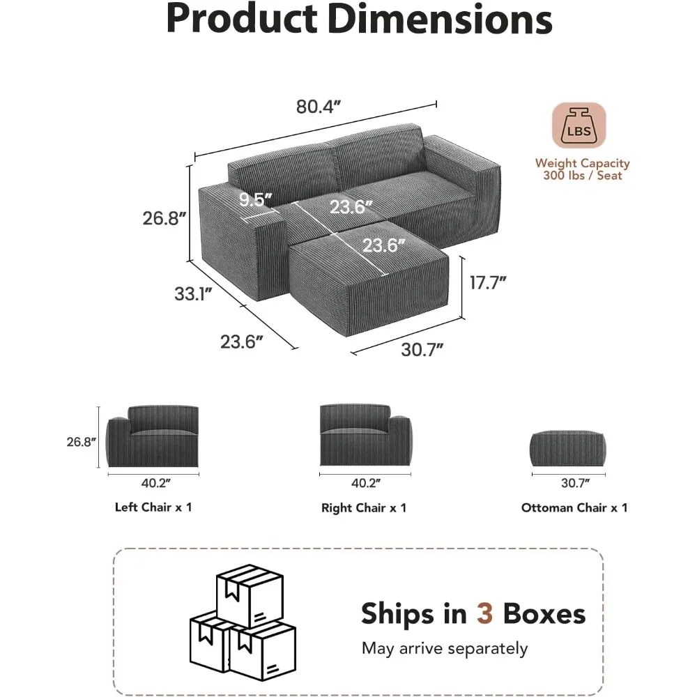 80 L Shaped Sofa Modular, Corduroy Couches with Deep Seats &High-Back, Upholstered Couches for Living Room Bedroom
